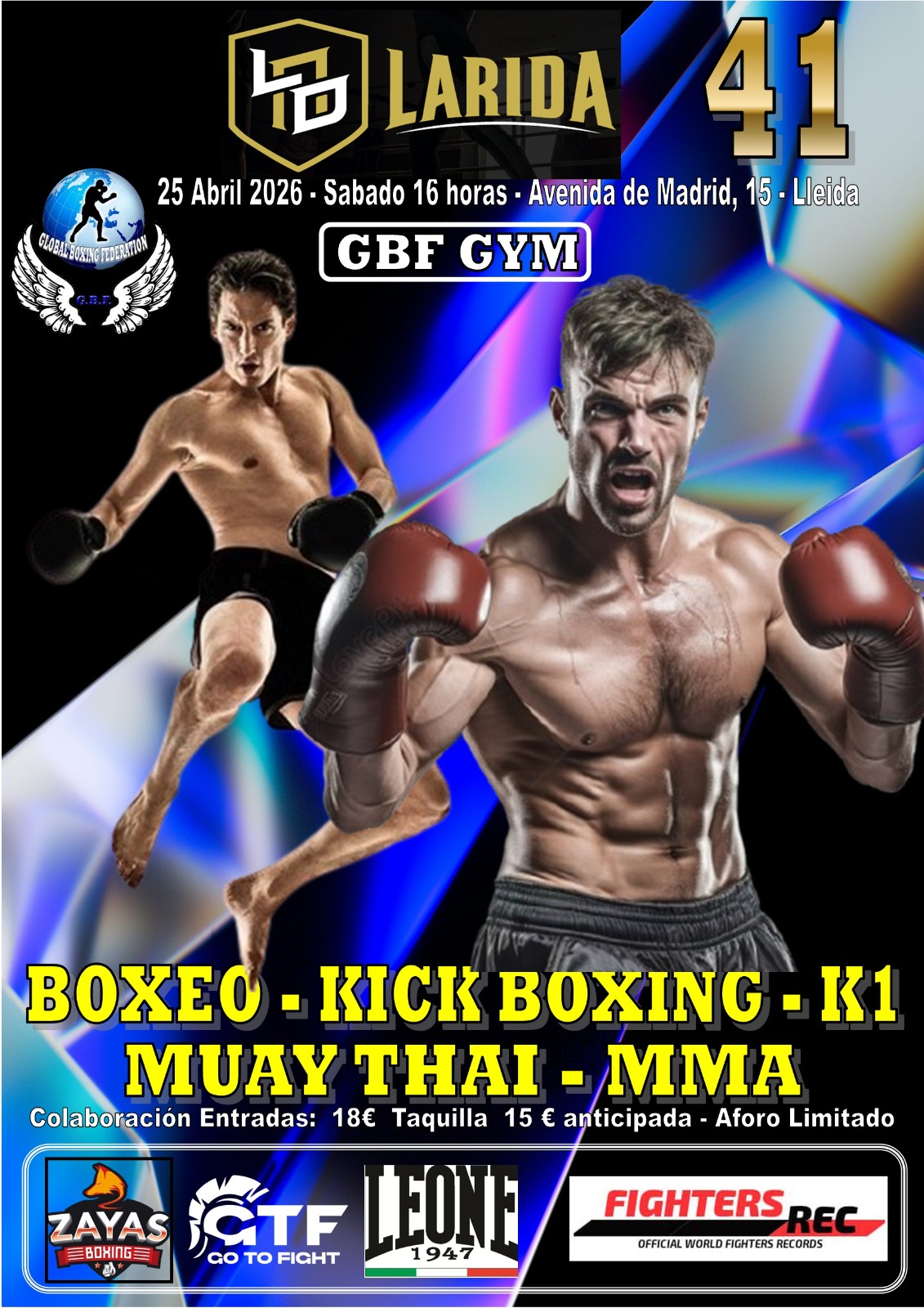 El 25 de abril de 2026, llega a Lleida Larida 41, una noche única con lo mejor de las artes marciales: boxeo, MMA, kickboxing, K1 y muay thai en un espectáculo lleno de adrenalina.